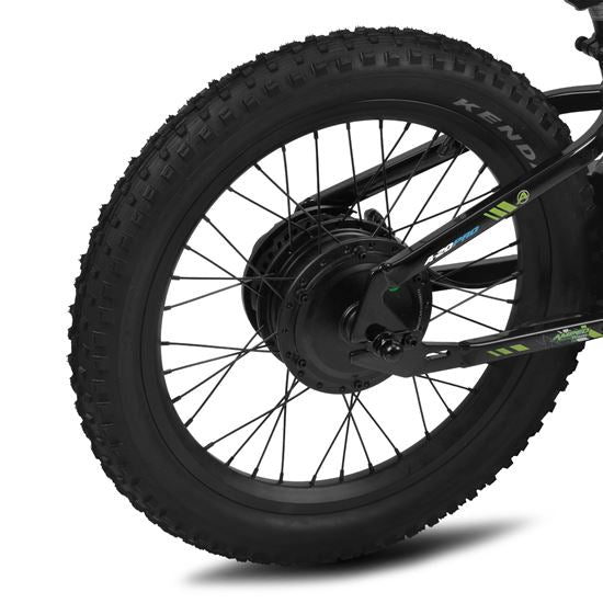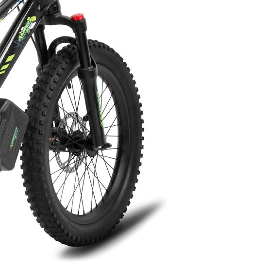 Cykeln är utrustad med 20 x 2,60 tum komposithjul och pneumatiska Kenda fat-offroaddäck, vilket gör den redo för varierande underlag. De justerbara hydrauliska framgafflarna ger 80 mm fjädringsväg för en mjuk och stabil körning.